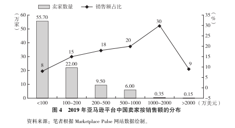 由图4 可知, 2019 年亚马逊平台销售额超过 1000 万美元的中国卖家有 5000家, 数量仅占0.5%, 市场销售额占比却高达近 40%。而小于 200 万美元销售额的中小卖家数量占比高达77.7%, 而销售额占比仅有23%。对于广大中小卖家来说, 根据亚马逊飞轮理论, 应不断优化自己的供应链, 选择品质更好或价格更低的产品, 从而在未来保持长久和持续的客户增量, 才有望成长为大型卖家。