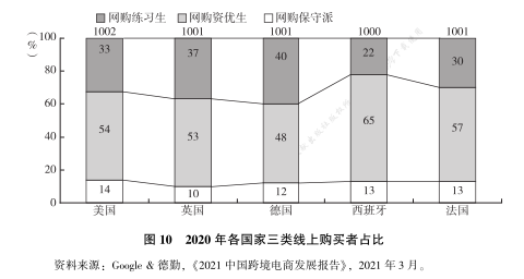 欧美国家是跨境电商的红海市场,竞争非常激烈。根据 Google &德勤在 2021 年报告中的市场调查, 在过去的 12 个月中,大部分国家有超过 30% 的买家是第一次在线上购物 ( 网购练习生)。西班牙有65%的买家在过去一年拓宽了原本购买的品类(网购资优生)。在过去一年,超过 10%的买家维持或增加了线上购买的金额( 网购保守派)。这样的变化暗示着未来线上购买会持续增长,网购便利与优惠的吸引力,会不断沉淀更多的客户,从而扩大整个跨境电商市场的规模(见图 10)。