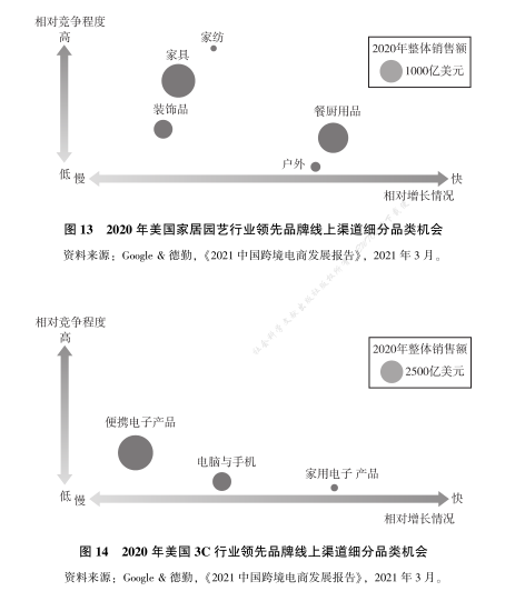 在家居园艺行业中, 餐厨用品和户外用品相对增长较高, 而家纺和家具品类的相对竞争程度较高 (见图 13)。3C 行业中, 家用电子产品增长较快, 但是整体销售额很低, 市场仍然是以便携电子产品为主导 (见图 14)。