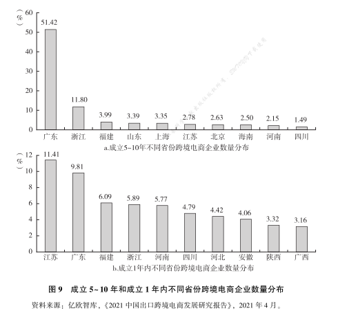 由图 9 可知, 根据成立 5~10 年不同省份跨境电商企业的数量分布情况, 可以看出主要地区以沿海城市为主, 广东省占比过半。据 《南方都市报》 2021 年 7 月报道, 在海外最大的电商平台——亚马逊平台上, 70%的卖家来自中国;而在中国的跨境电商中, 广东的卖家能占到 70%, 这当中50%的份额来自深圳。但根据成立不到 1 年的企业数量看, 江苏、 福建等省份增长明显。截至 2021 年底, 我国总计批复了 105 家跨境电商综试区,将为这些区域的企业带来更多的政策支持。