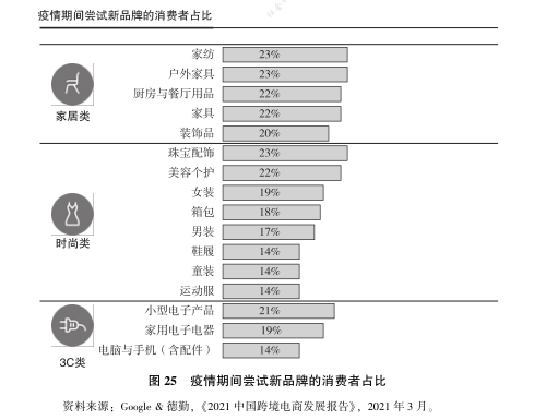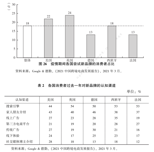 目前中国的国内品牌正在加速通过跨境电商途径实现品牌出海, 而海外消费者线上购物的品牌认知度也不断提高, 说明品牌出海正当其时。跨境电商海外市场三大品类中, 尝试新品牌的消费者占比平均值分别为家居类22%、 时尚类 17. 6%和 3C 类 18%。其中值得注意的是珠宝配饰、美妆个护、小型电子产品和家用电子电器的比例也都在 20%左右, 高于其他细分类目 (见图 25)。疫情期间各个国家尝试新品牌的消费者整体占比为 18%,最高的是美国和英国 (见图 26)。疫情后主要推广媒介是线上广告和社交媒体博主介绍, 其中值得注意的是美国有高达 28%的消费者会参考博主的推荐, 高于线上广告和线下体验 (见表 2)。
