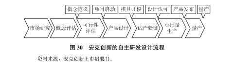 第一种:以安克创新为代表的 “重精品” 模式。在跨境电商企业中,安克创新是一家非常重视产品自主研发的上市公司 (见图 30)。安克创新的“重精品” 模式本质上与品牌企业的运营模式没有区别, 都是从产品的销量预测开始, 进行产品自主研发, 定款后进行备货销售 (见图 31)。“重精品” 模式下, 销售的目的是打造品牌, 因此可以容忍前期的低毛利、高成本,而追求高质量、高品牌忠诚度, 最终取得品牌认知、品牌溢价。“重精品”是一种“长期主义”的运作方式, 投入大、产出慢,一般难以为机会主义的跨境电商卖家所模仿。