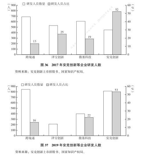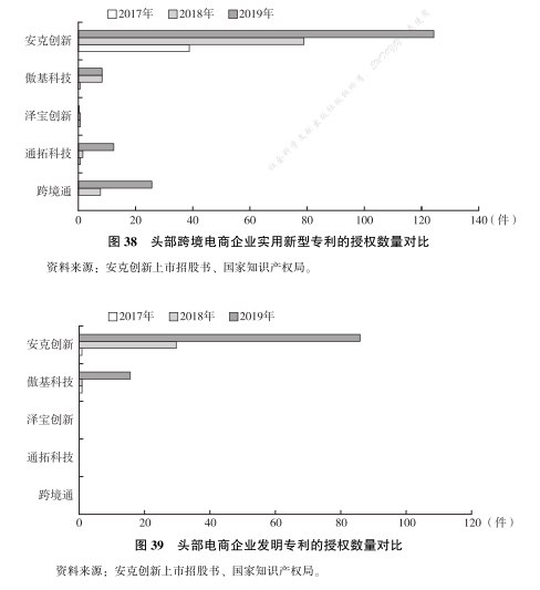 安克创新可谓跨境电商重精品模式的领头羊。首先, 从研发投入的角度, 由图 36 和图 37 可知, 2017 年时, 跨境通 (上市公司, 旗下包括环球易购、帕拓逊等跨境大卖家, 其中环球易购目前处于破产清算过程中)、泽宝创新、傲基科技和安克创新四个大卖家的研发人数相差不大, 但是安克创新的研发人员比例超过 50%。至 2019 年, 跨境电商企业中傲基科技和泽宝创新研发人数和人员比例双双下降, 而安克创新拥有超 800 人的研发人员,增幅近 1 倍, 其中研发人员的比例依然保持在半数以上。其次, 从研发产出的角度, 安克创新的营收从 2017 年的 39 亿元增长到 2019 年 66 亿元, 可见其公司对研发部门的投入卓有成效。作为跨境电商企业的独角兽企业, 安克创新的实用新型专利、 发明专利的数量远远超过其他头部公司, 核心竞争优势非常明显 (见图 38、 图 39)。