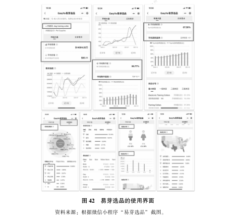 首先, 建议选择基于欧美 C 端消费者评论分析数据为基础的选品软件。目前市面上大部分的选品软件都是基于 B 端竞争对手的产品市场分析数据,而真正基于欧美 C 端消费者评论分析数据进行选品的工具并不多。其中,易芽选品 SaaS 工具是一个典型代表, 以图 42 为例, 易芽选品可以通过关键词迅速地找到相关的市场规模、 市场价格、 市场趋势以及最重要的买家需求。通过买家的评论反馈、 关注点分析、 消费者画像, 跨境电商卖家可以更好地把握产品研发的方向, 提升轻精品的成功率。其次, 走轻精品路线的跨境电商卖家, 还需要注重 “精准选品—精品供应链—精控运营” 的 “三精” 综合打法, 注重与产品设计公司、 产品定义公司、 精品供应链团队 (如易芽跨境研习社) 的及时交互, 才能打造有创意的精品, 实现单点突破, 打造成功的爆品。