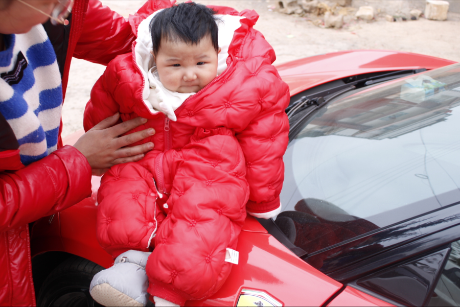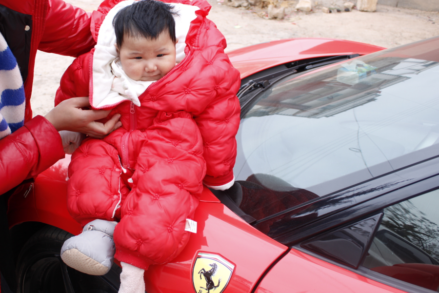 看这个可爱的小朋友的表情似乎并不是很情愿,毕竟法拉利是外国品牌。