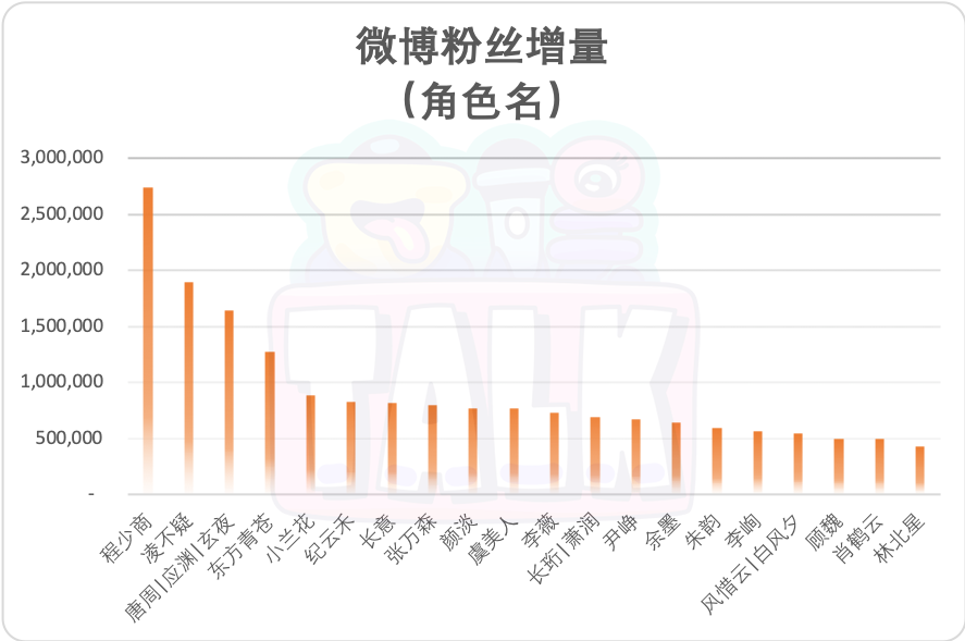 男演员横向对比,王鹤棣(《苍兰诀》)体感上声量最大,但实际粉丝增幅上,吴磊大于成毅大于王鹤棣;剧集热播期间,商务转化上也没有过大的差距(仅对比数量)。王鹤棣新增百事可乐与99公益日的代言合作、观众看着长大的吴磊在《星汉》期间也新增了明治、成毅则喜提了优酷代言人。