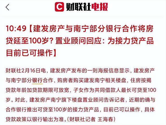继南宁楼盘宣传延长房贷可以还到80岁后(《太狠了!房贷都可以还到80岁了……》),更离谱的“百岁贷”出现了……