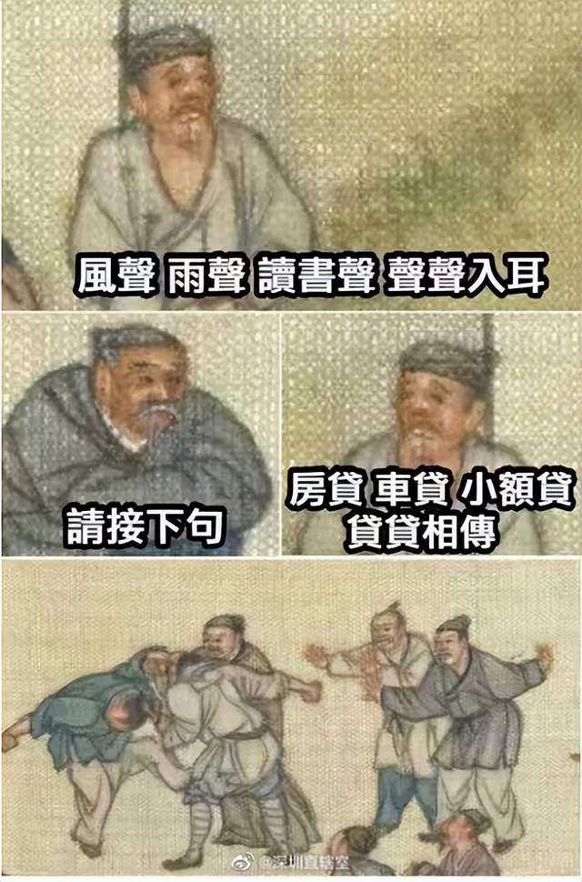 还有网友进行二次创作:“风声雨声读书声,声声入耳;房贷车贷小额贷,贷贷相传。”