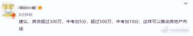 有网友提出更夸张的建议:“房贷超过300万,中考加5分,超过500万,中考加10分,这样可以推动房地产市场。”