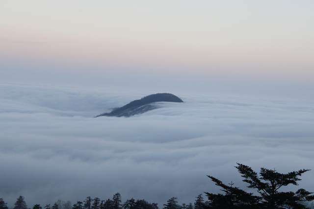 云雾随风流散,状如波涛,云雾中露出的山顶倒像是传说中的海外仙岛。