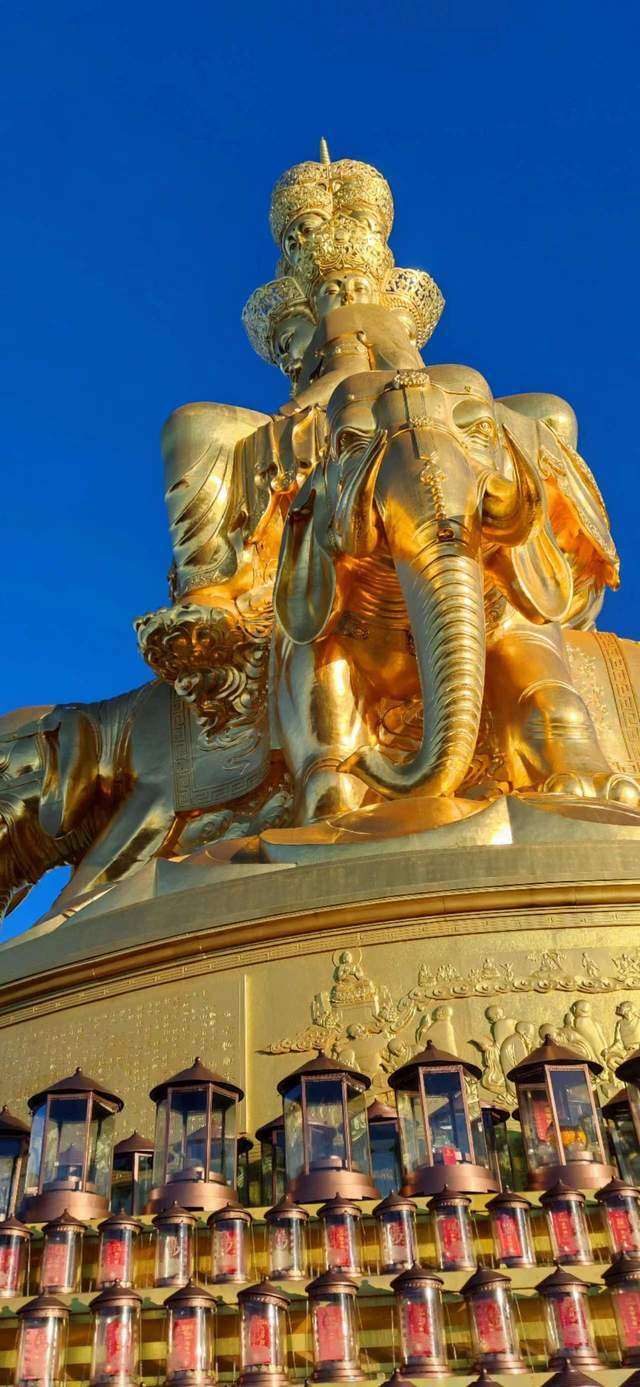 这尊十方普贤金像位于峨眉山金顶,于2006年6月18日落成 ,通高48米,重达600多吨,建筑面积1000㎡,是世界上最大、最高的十方普贤像。