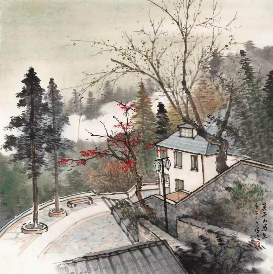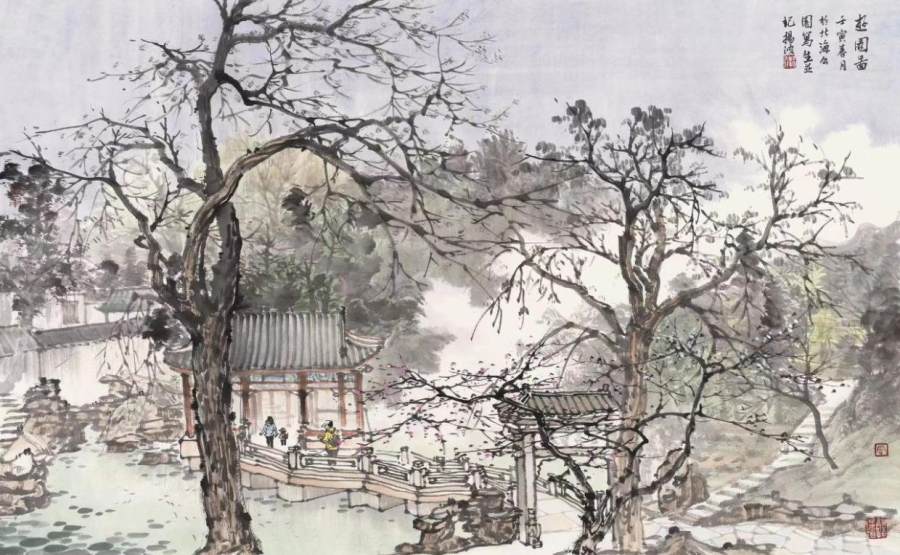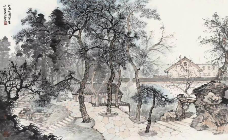 从这件作品中亦可看到,扬波在语言上特别注重线条的劲拔苍厚,以线勾勒再加以皴染,浓淡有度,渲染得当。笪重光说:“山川之气本静,笔躁动而静气不生;林泉之姿本幽,墨粗疏则幽姿顿减。”正因为扬波的笔墨语言能够做到朴厚而沉酣,稳重而圆活,笔下景物才有“幽姿”和“静气”,这对一个年轻的山水画家来说是殊为不易的。