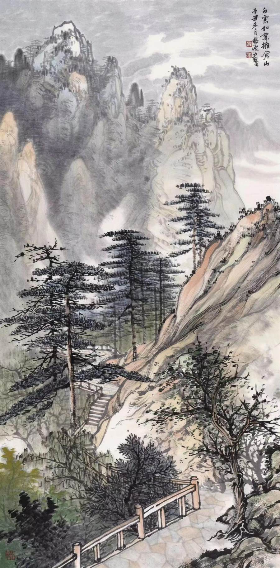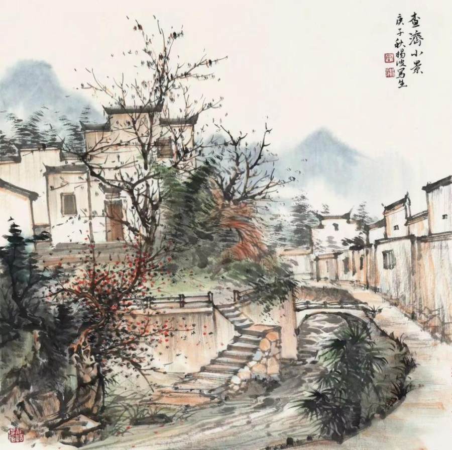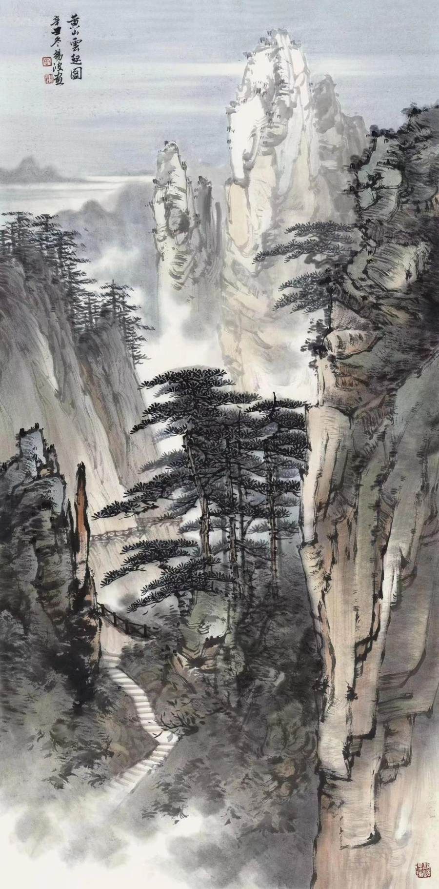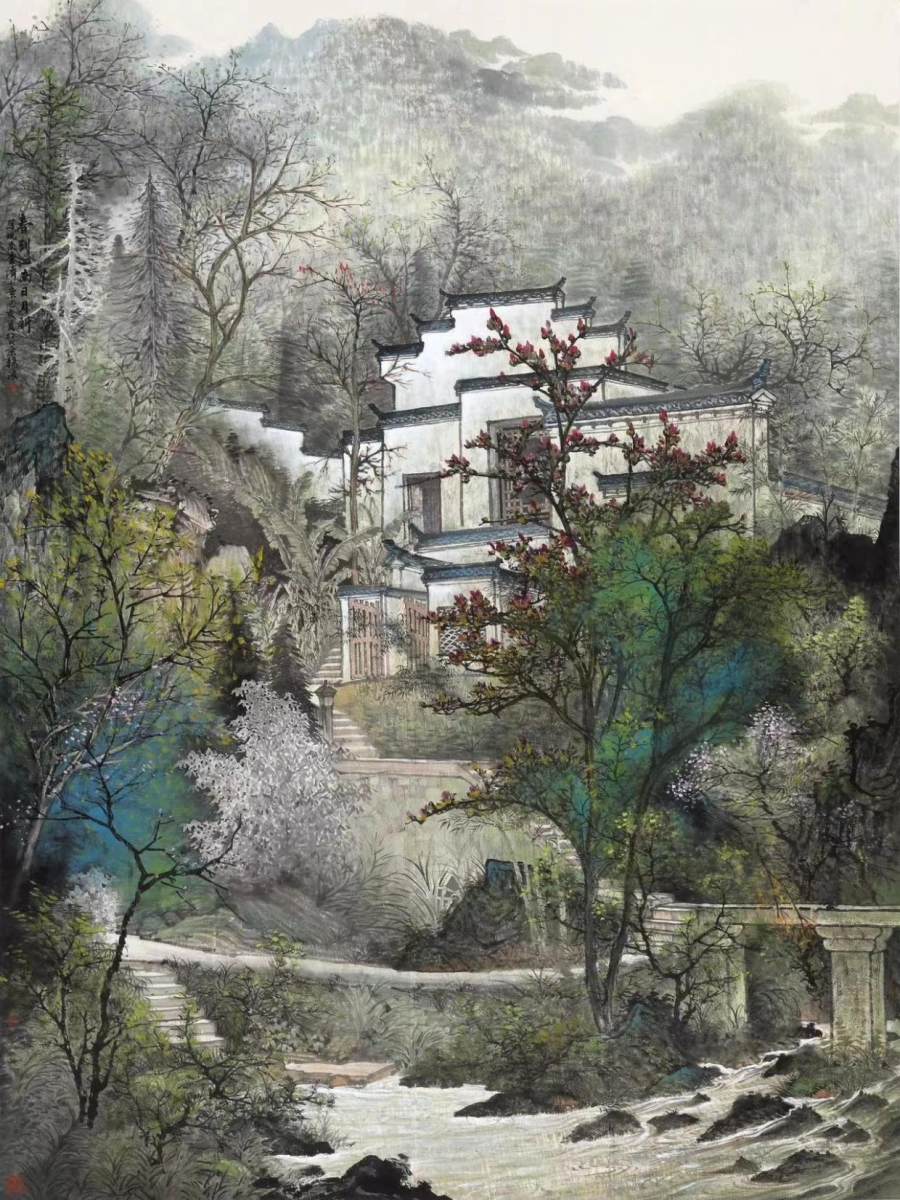 写生而来的图式探索与传统笔墨的锤炼是相辅相成的,两者互为表里。因而,在扬波的创作中,往往可以见出写生般的新鲜劲和真实感。如《一湾碧水绕村流》《周末行者》《春到江南日日新》《隔水青山似故乡》《黄山云起图》《太行秋高图》《新安江胜境图》《忆江南》《张家界印象》《空谷秋声》等等。《隔水青山似故乡》的图式既有传统山水的法则,又有写生得来的真实感。这件作品采用横幅构图,“平远法”与焦点透视的结合,使得画面既传统又现代,很好地表现出峰峦秀美,水阁幽奇,蒲缘幽涘的南方山水,同时也表达了对家山的浓厚情感。