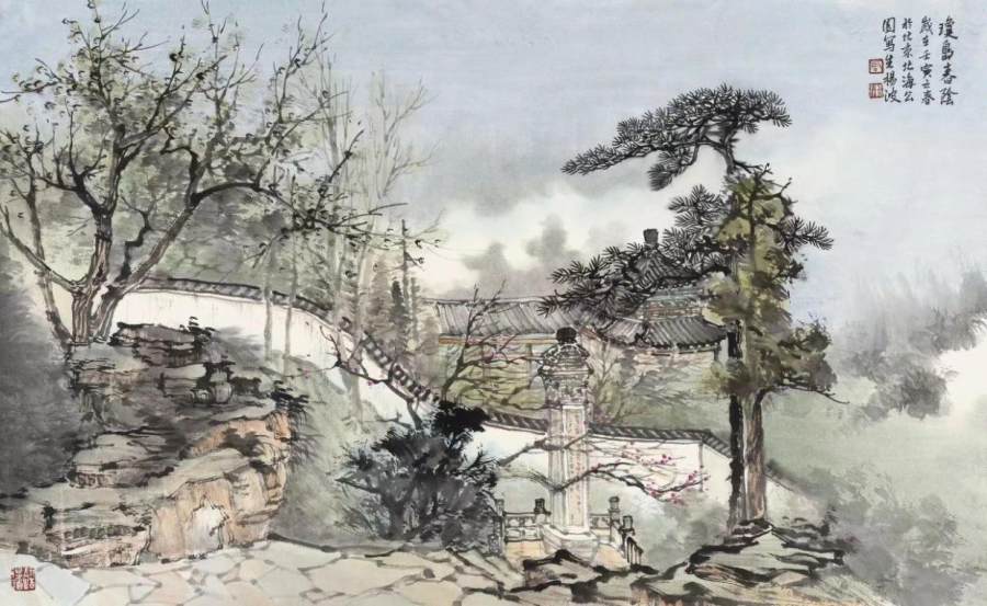 从2018年到2022年,杨波创作了不少写生作品,如《漓江烟雨图》《龙脊途中所见》《莫干山小景》《桃花潭印象》《土楼晨韵》《北海公园》等,这些作品很能说明“笔墨之探奇”和“山川之写照”之间的关系。以2018年所作的《漓江烟雨图》为例,画中所呈现的景物既是现实的,又是富有意象美感的。画家以游观的方式,表现目之所及的景物,以秀逸峭拔之笔墨,描绘出漓江春雨之清丽温润,既体现出笔墨技巧的工夫,也较恰当地表现出“真山水”的韵致和独契灵异的理想精神。