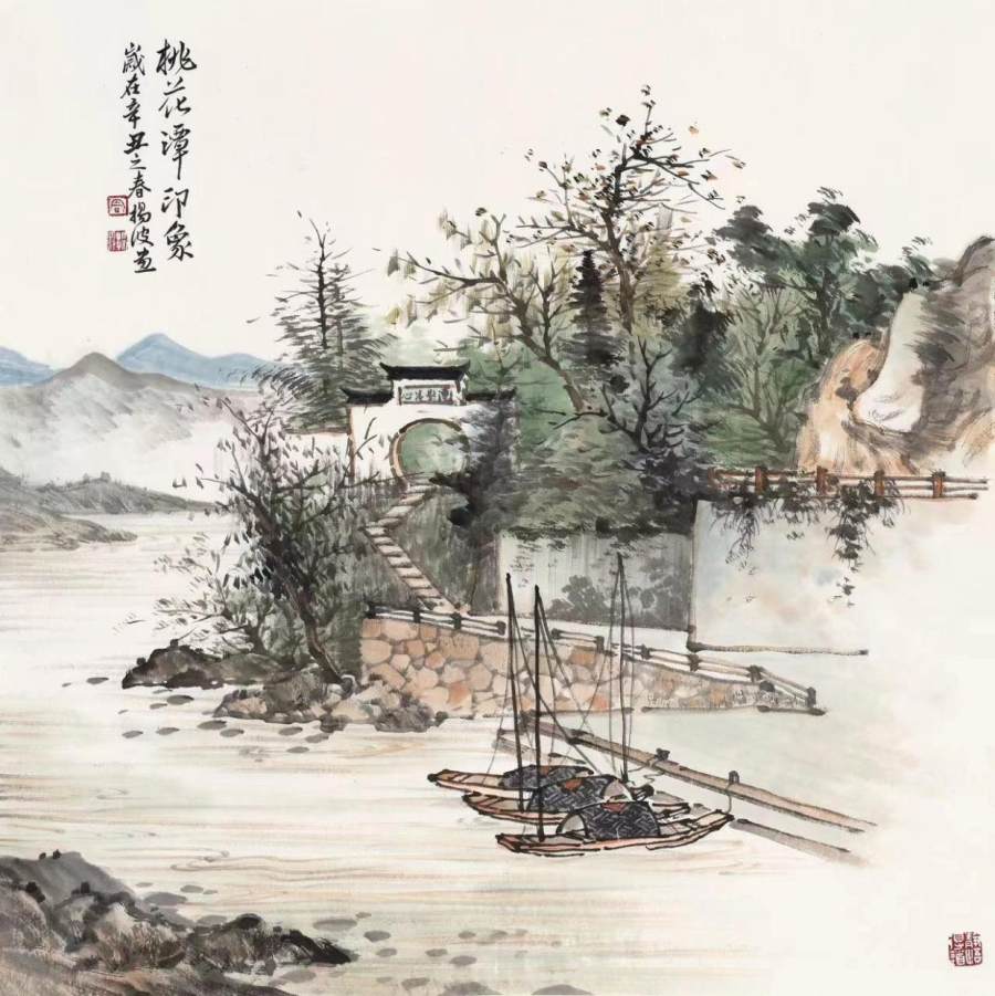 在色彩上,扬波既能淡雅亦能浓郁,如《一湾碧水绕村流》便是以浓厚的色调来表现山区农村的景象,以石青、石绿、赭石等色与线、墨进行相互渲染、渗透,使画面丰满温润,神采焕然。在这里,画家将彩色与墨色放置在同等重要的位置,以墨为色,以色为墨;墨不碍色,色不碍墨。这种墨色交融的方式,带给画面明秀苍润的艺术效果,使平常之景成为佳境。