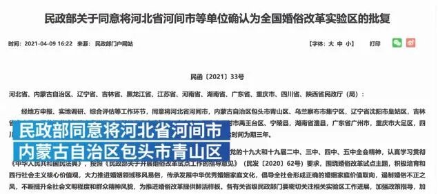 6)民政部:同意将河北省河间市,四川省成都市武侯区、河南省开封市禹王台区、宁陵县等单位确认为全国婚俗改革实验区,实验时间为期三年。