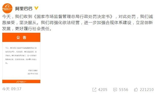 1)4月10日,市监总局依法对阿里巴巴实施“二选一”垄断行为作出行政处罚,责令阿里巴巴集团停止违法行为,并处以其2019年中国境内销售额4557.12亿元4%的罚款,计182.28亿元。阿里巴巴:对市场监管总局处罚诚恳接受,坚决服从。