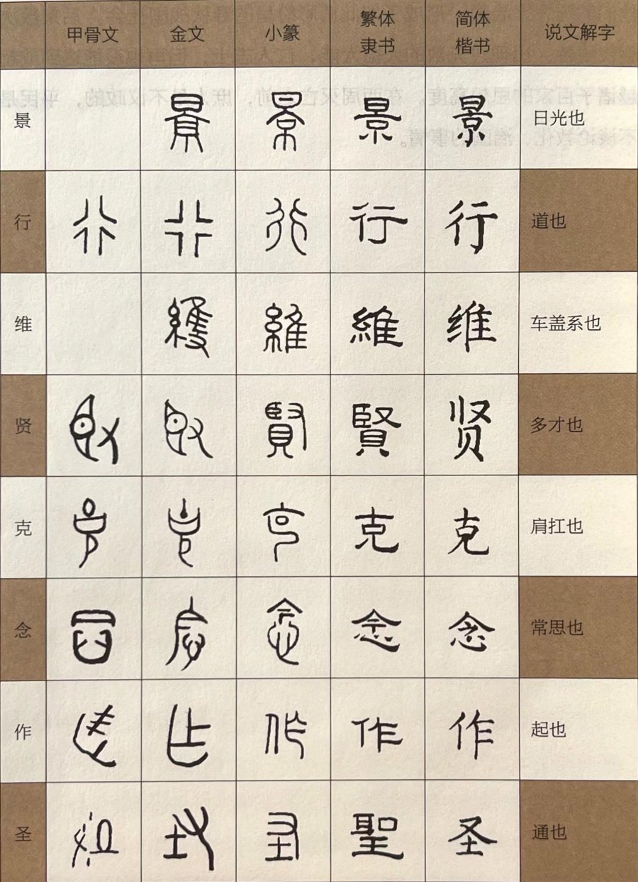 “景”,本义是:太阳在高大亭台上投下的影子。在《说文解字》里的解释是:日光也。《尔雅》里讲:“四时和谓之景风”。“景”是多音字,读jǐng,作名词时,有日光、风景、情况等意;作动词时,指仰慕之意;作形容词时,有大的、高的、祥瑞等意。也读作yǐng,古同“影”,是影子的意思。在这里读作jǐng,是高尚、光明的意思。