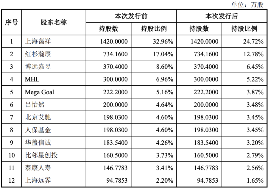 IPO前,上海蔼祥持股32.96%,红杉中国通过红杉瀚辰持股17.04%,博远资本通过博远嘉昱持股8.60%,MHL持股6.96%,MegaGoal持股5.16%,吕怡然持股4.64%,北京艾驰、人保基金均分别持股4.60%,华盖资本通过华盖信诚持股4.26%。