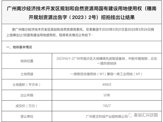 近日,根据公开资料,广州市南沙区大岗穗港先进智造基地DD0402074地块,由广州易文科技产业园有限公司,以人民币1.1627亿元竞得,用于建设易创汇科技园产业园区项目。