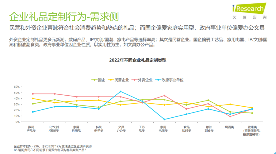 在《2022年中国企业礼品定制行业白皮书》中,艾瑞指出在需求侧,民营和外资企业青睐符合社会消费趋势和热点的礼品,而国企偏爱家庭实用型,政府事业单位偏爱办公文具。具体来看,数码产品、IP/文创/国潮、家电产品、科技电子类都属于符合社会消费趋势和热点的礼品。