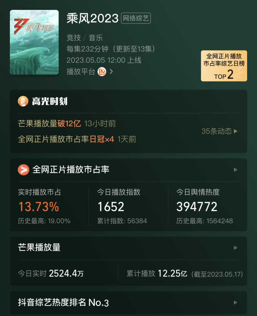 根据灯塔数据,上线12天的《乘风2023》今日全网正片播放市占率13.77%,综艺日榜第二,历史最高是首播当日的19%,目前累计播放12.25亿,首播当日播放量即突破1亿,上线第二天登顶灯塔舆情热度日冠军之席位,并稳稳霸占,目前抖音综艺热度排名第三。