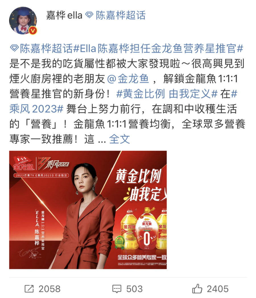 Ella拿下了金典有机奶推荐官、合生元品牌代言人、德芙品牌大使三个品牌的合作,同时又新增了金龙鱼星推官。除了Ella之外,卢靖姗和刘逸云则成为了斯维诗的品牌大使。