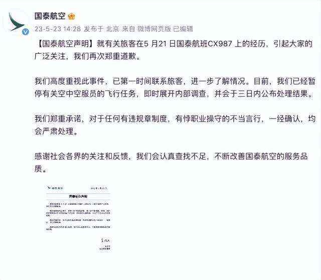 5月23日,国泰航空发布声明,就有关旅客在5月21日国泰航班CX987上的经历再次道歉。声明称,目前,国泰航空已经暂停有关空中空服员的飞行任务,即时展开内部调查,并会于三日内公布处理结果。