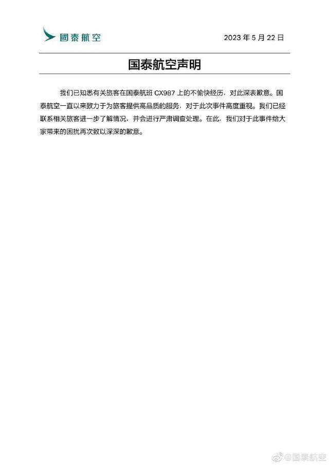 5月22日晚,@国泰航空 发布声明:已知悉有关旅客在国泰航班CX987上的不愉快经历,对此深表歉意。国泰航空一直以来致力于为旅客提供高品质的服务,对于此次事件高度重视。我们已经联系相关旅客进一步了解情况,并会进行严肃调查处理。在此,我们对于此事件给大家带来的困扰再次致以深深的歉意。