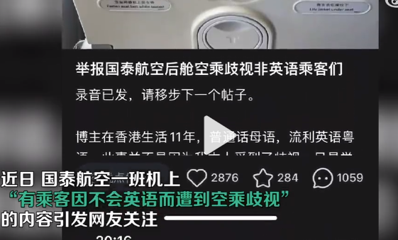 5月22日,有旅客在小红书发帖“实名举报国泰航空歧视非英语乘客”。帖子提到,其搭乘国泰航空CX987航班由成都飞往香港,选座为后排、靠近乘务员准备餐食及休息处。但是自坐下开始,不断听见后舱乘务员用英文及粤语抱怨、歧视旅客。
