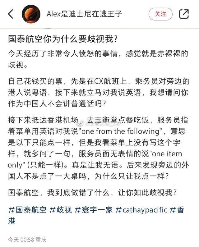 事件发生之后,又有网友控诉自己遭到国泰航空的歧视:空乘对港人说粤语,对内地客说英语。在餐厅点菜时,外国人点了一大桌,内地客只能点一样。