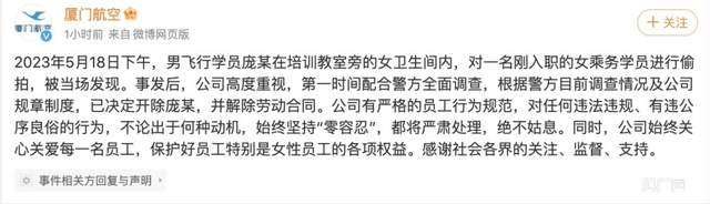 厦门航空男飞行学员庞某偷拍刚入职的女乘务学员被开除解除合同