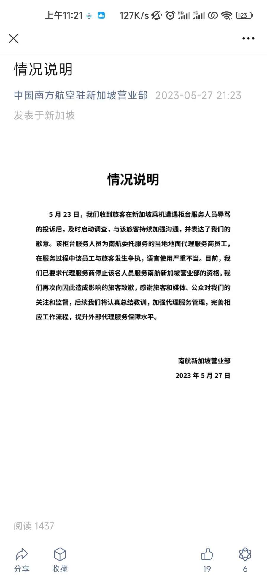 中国南方航空驻新加坡营业部2023年5月27日21:23发表于新加坡的《情况说明》如下: