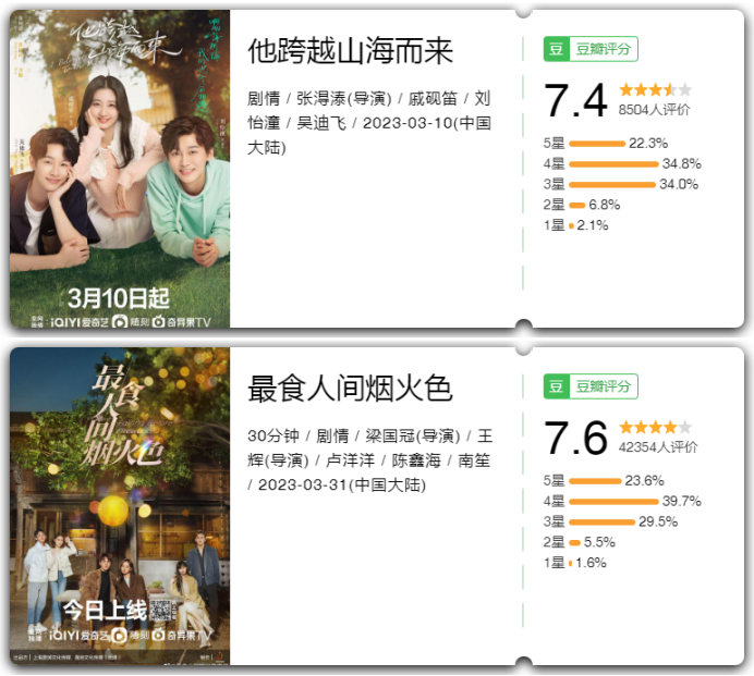 这样一看,今年的小甜剧们似乎都格外争气,小娱统计了1月至5月平台播出的31部S级以下小甜剧(爱情题材),豆瓣开分有17部,其中7成以上达到及格线,将近5成达到6.5分以上,3部7分剧,分别是《最食人间烟火色》《他跨越山海而来》以及《你给我的喜欢》。