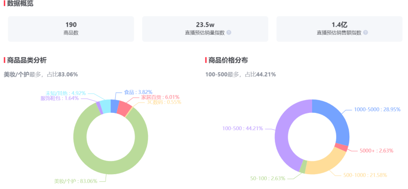 据灰豚数据,章小蕙直播品类中,美妆/个护产品占比83.06%,家居百货占比6.01%。从商品价格看,100-500元价格区间的商品最多,占比44.21%。该场直播涨粉5.5w,直播预估销量23.5w,直播预估销售额1.4亿,照此计算客单价约为595.74元。