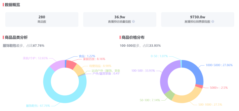 相比之下,董洁更偏重服饰类商品,且客单价更低。以董洁5月25日最新直播数据为例,当天直播商品服饰鞋包最多,占比67.76%。直播预估销量36.9w,直播预估销售额9730w,照此计算客单价约为263.69元。