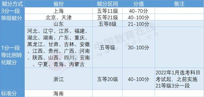 首批试点省份上海和浙江采用的是3分一段的等级赋分制,起评分为40分。第二批试点的山东省,吸取首批试点省市的经验,结合本省考生数量大的实际情况,采用了1分一段的等比例赋分,起评分为21分,增加了赋分成绩的区分度。