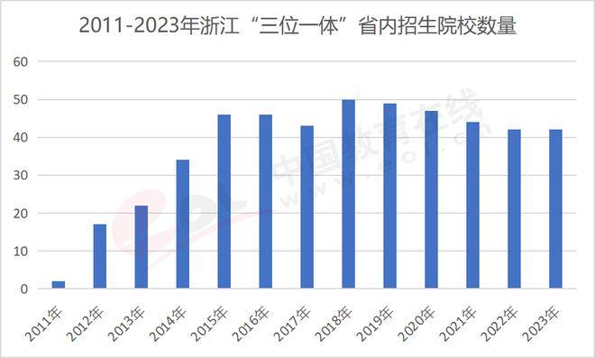 浙江省实施综合评价招生的规模最大。2011年,浙江省率先在浙江工业大学、杭州师范大学和中国美术学院三所省内高校实施“三位一体”综合评价招生试点,到2018年以后,在浙江省实施“三位一体”招生的省内外高校在60所上下,2023年共有42所省属高校以及包含浙江大学在内的9所高水平大学在浙江省实施了“三位一体”招生。