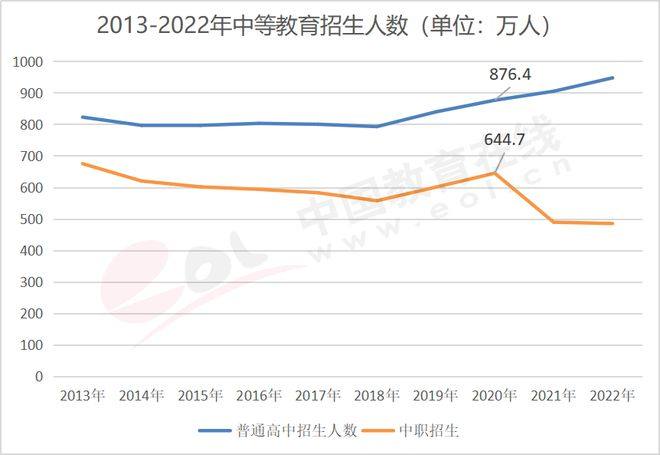 3年前的2020年,全国普通高中招生876.4万人,比上年增长36.91万人。中等职业招生644.7万人,比上年增长44.33万人,两者合计增长达81.24万人,基本逼近今年高考报名净增长人数。