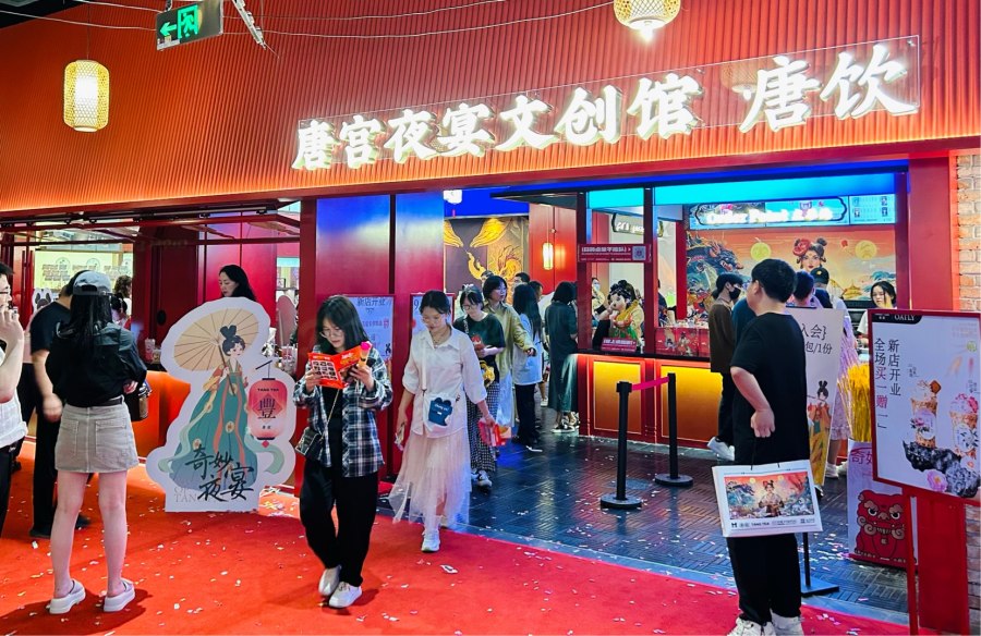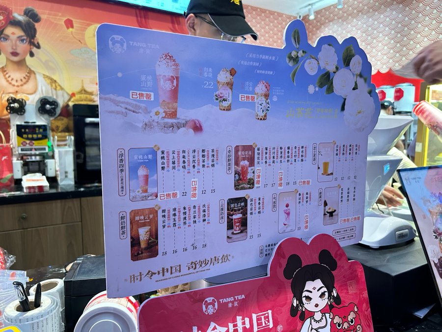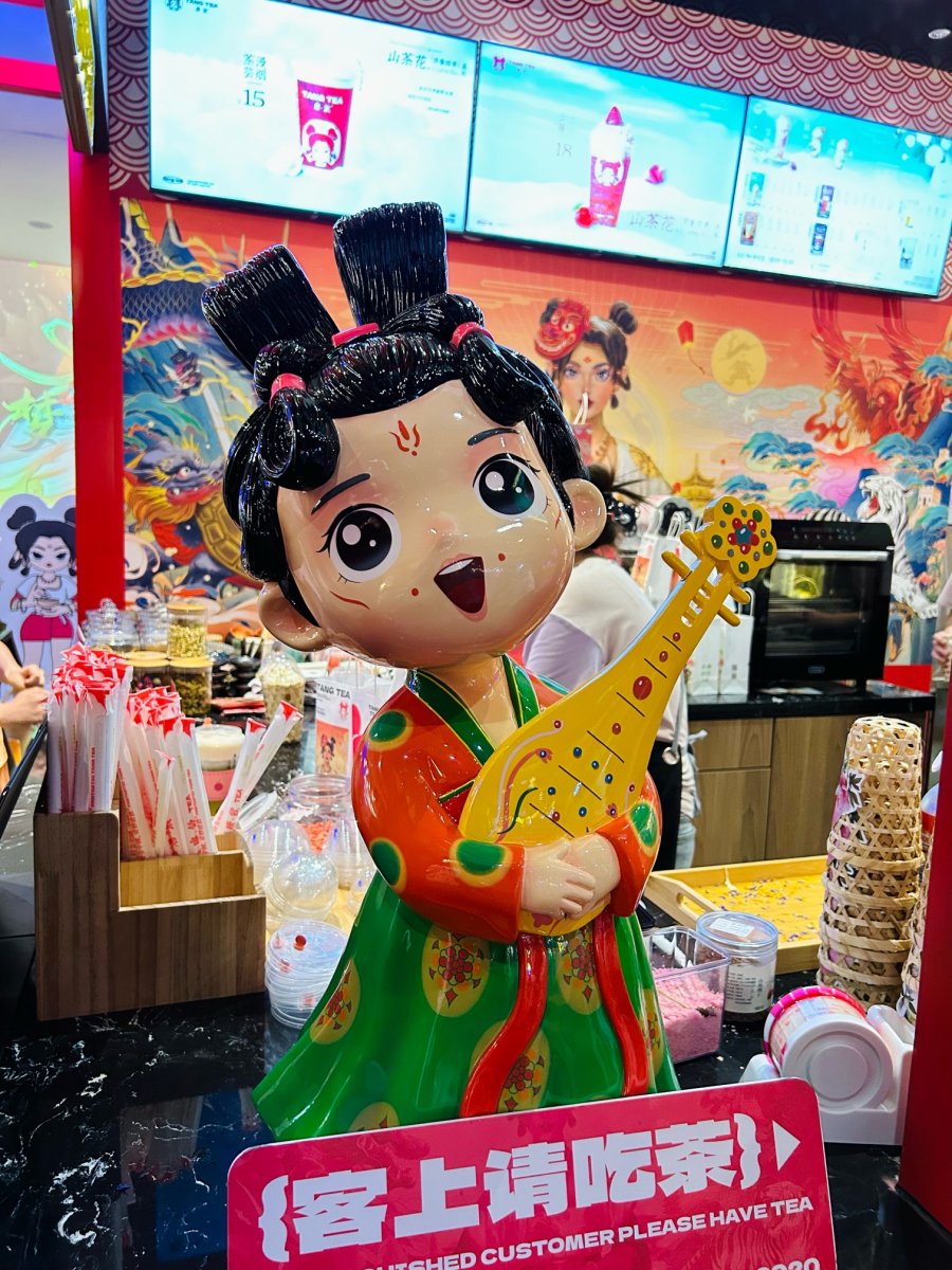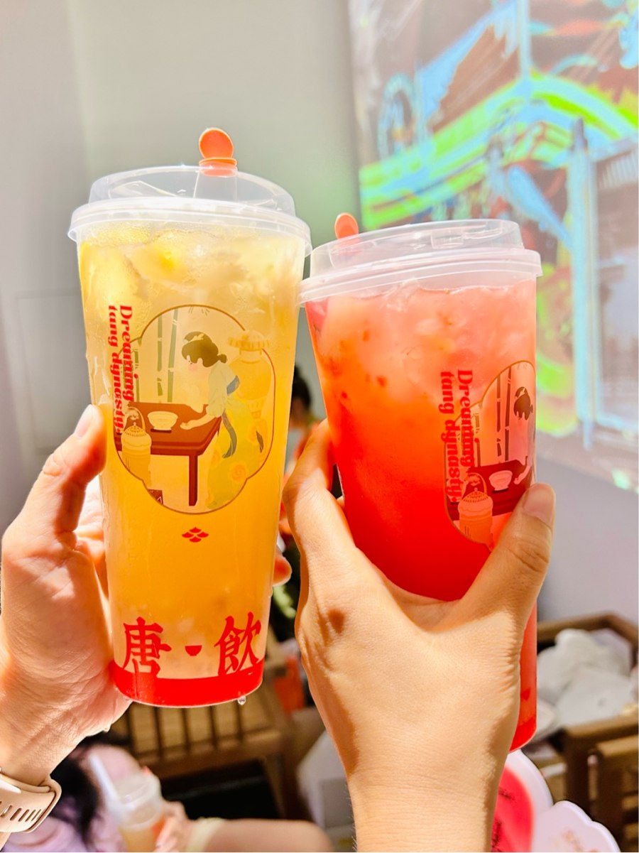 百分之百原茶叶、纯牛乳、真水果,鲜奶鲜茶现做…把承诺打在招牌上的唐饮,跟唐宫夜宴做了官方联名,在小小的国贸1948主题商业街区,开起了大大的唐宫夜宴文创馆,有吃有喝有好玩。