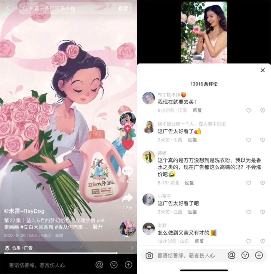 事实上,这条收获无数关注度和好评的短视频,是立白大师香氛的广告投放。能够让用户和消费者主动认可一条广告,殊为不易。立白大师香氛洗衣液也因此在短视频平台上成为讨论的焦点,向年轻人心中的高端洗衣液靠拢。