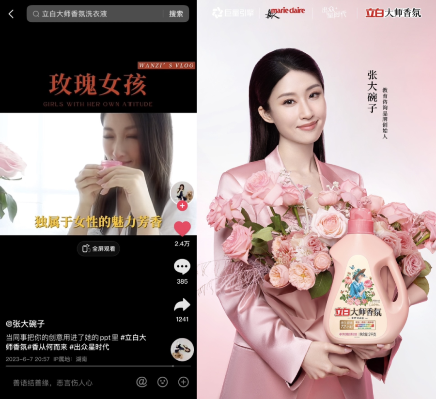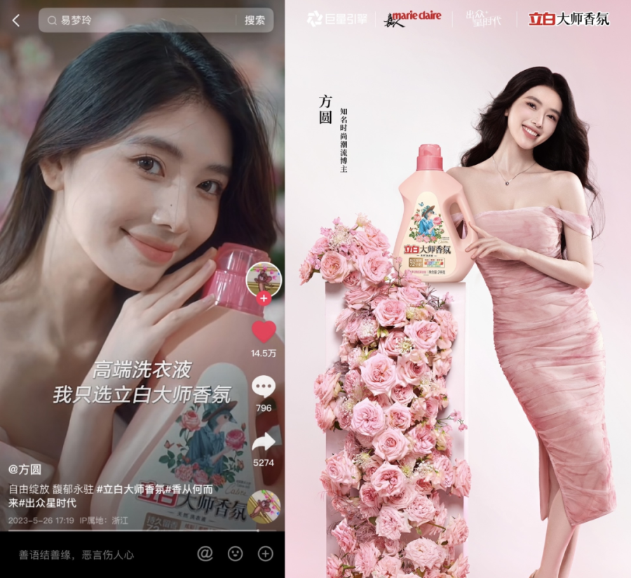 再加上与时尚媒体《嘉人》的合作,使得立白大师香氛品牌和抖音头部达人都获得了更为有力的时尚背书。