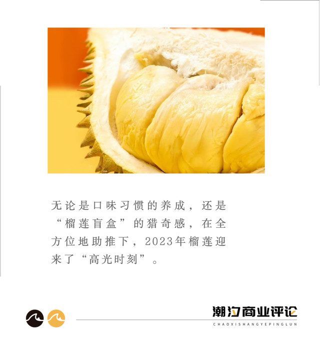 无论是口味习惯的养成,还是“榴莲盲盒”的猎奇感,在全方位地助推下,2023年榴莲迎来了“高光时刻”。