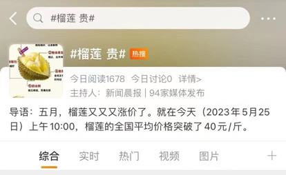 显然,Andy的反应并非个例。今年4月以来,榴莲的相关话题在各大社交平台上就没断过,“榴莲涨价”、“榴莲降价”、“榴莲盲盒”、“报恩榴莲”、“报仇榴莲”、“榴莲贵”……每一个话题热搜都流露着真情实感,将这些话题串联,上演的则是大家今年购买榴莲的“消费独白”。