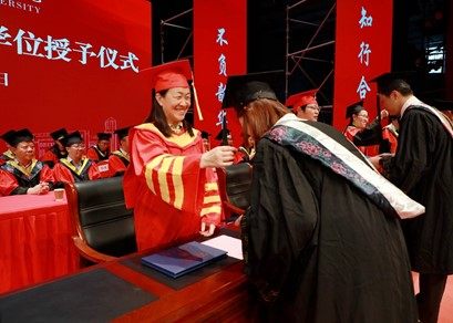 校领导分别为毕业生代表拨苏正冠并颁发证书