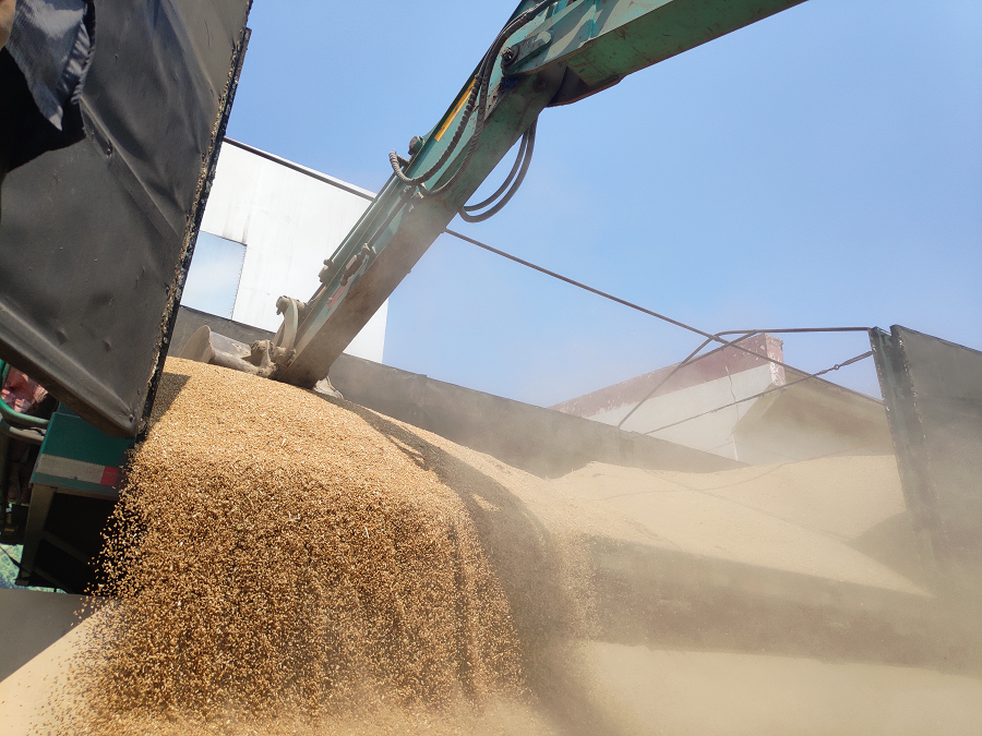 在卸粮现场,风机、振动筛呼呼生风,钩机拨拉着小麦送上输送机,风筛去杂后,粒粒金黄的小麦“排队”入仓。