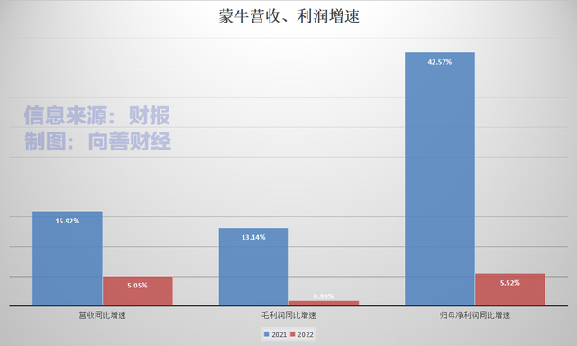 但根据蒙牛披露的2022年财报显示,2022年,蒙牛实现营收为925.9亿,同比增长5.05%;实现净利润为53.03亿,同比增长5.52%,虽然营收和净利润都实现了正增长,但和2021年的业绩增长速度相比,2022年蒙牛的业绩增速的放缓十分明显。