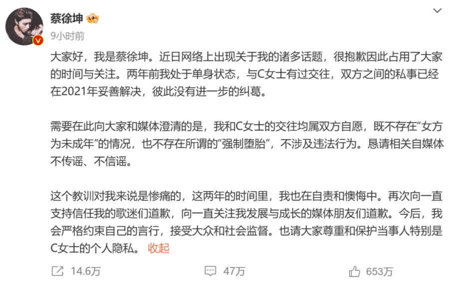 此前的爆料中,蔡徐坤被指与一女子发生一夜情,并导致女方怀孕,且女方疑似未成年。如今在微博的致歉声明中,蔡徐坤承认与C女士确实有过交往关系,但同时也声称:“双方之间既不存在‘女方为未成年’的情况,也不存在所谓的‘强制堕胎’。”