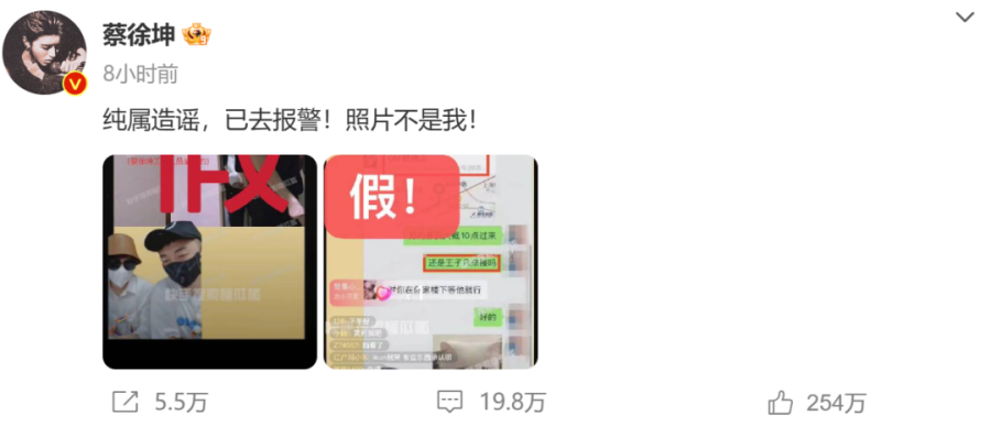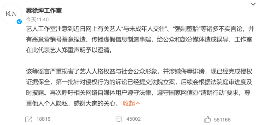 十分钟后,蔡徐坤工作室也在微博发布澄清声明,并表明将从法律层面起诉造谣者。