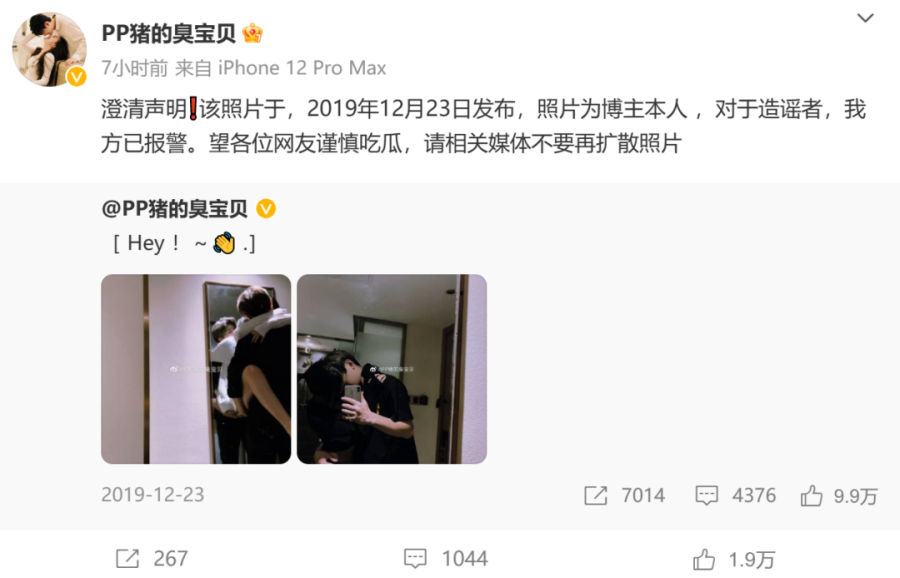 值得注意的是,W女士的新传闻出现后,涉事的另一当事人@PP猪的臭宝贝 很快出面澄清,照片中的人并非蔡徐坤,并声称已报警。